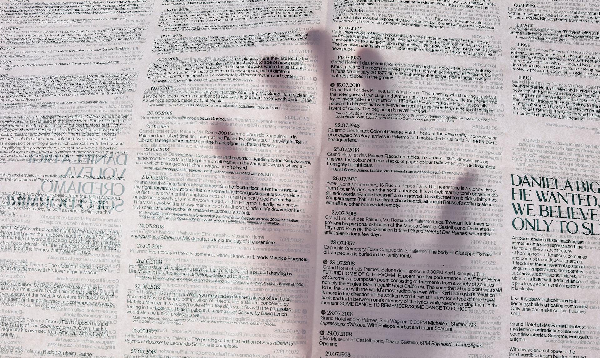 Proto-surrealist writer Raymond Roussel lived, worked and died at Grand Hotel et Des Palmes, Palermo. . So, artist and curator, Luca Trevisani staged a high-concept exhibition at the hotel to pay homage to Roussel in the environment where his work originated. The event saw 29 internationally renowned artists create and exhibit art inspired by Roussel at the hotel, generating a fantastic body of work.